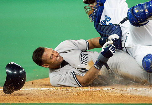 (Image from the NY Daily News) Ken Huckaby injures Derek Jeter with a knee to the shoulder on Opening Day, 2003. Though this play had no material effect on the Yankees' 2003 season or Jeter's career and Huckaby is no relation to Mike Huckabee, the world needs to remember that this happened.